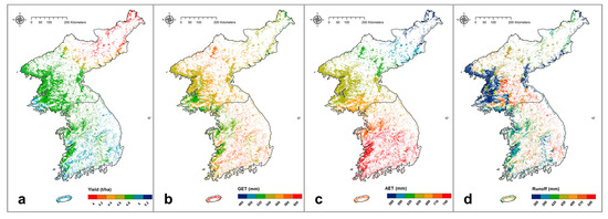In this study, we estimated four variables (crop yield, GET, AET, and runoff) using the GEPIC model for each grid cell of size 1 sq. km. Rice was used as a model crop since it is the key food crop in the Korean Peninsula and has a high water demand [22,46,47]. The key crop parameters were set following Xiong et al. [47], and Tan and Shibasaki’s [48] calibration result for rice using the EPIC model. The biomass–energy ratio was set to 30 kg MJ−1, optimum temperature to 25 °C, base temperature to 10 °C, harvest index to 0.60 mg mg−1, and potential heat unit (PHU) range to 1300–1800 °C, depending on the specific grid cell climate.