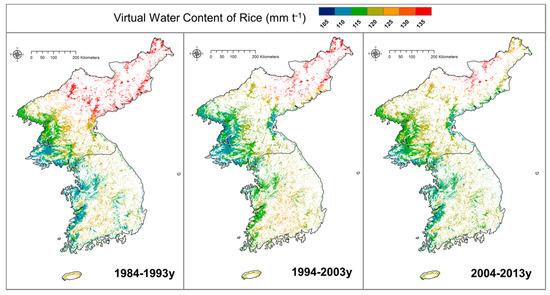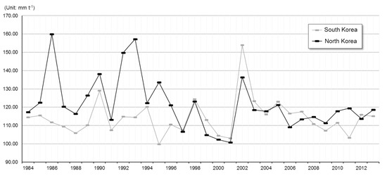 In the 1980s, the VWC in South Korea was 113.2 mm/t, while North Korea was 132.1 mm/t for the same period, which showed that the quantity of water consumed for crop production in the two regions differed considerably. However, this difference became smaller over time. In the 1990s, in South Korea the VWC was 115.9 mm/t, and in North Korea, 116.9 mm/t; though in the 2000s, South Korea recorded a VWC of 113.6 mm/t, and North Korea 115.7 mm/t (Figure 4). It was confirmed that the above changes over time were caused by the improved potential crop productivity in North Korea following the rise in temperature. However, the actual food productivity of North Korea was not seen to improve in the same period, largely owing to social influence [63,64].