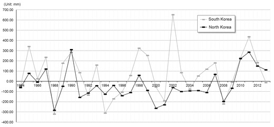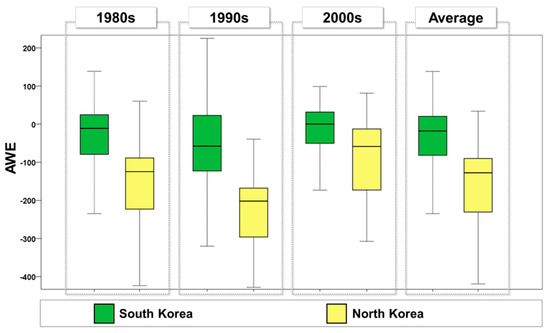 When comparing South Korea and North Korea, it was confirmed that the AWE for South Korea has been higher at all times. In the 1980s, AWE for South Korea and North Korea were −32.7 mm and −152.8 mm, respectively; while in the 1990s, South Korea was 62.1 mm and North Korea was −227.2 mm. In the 2000s, South Korea was −25.5 mm, and North Korea was −87.7 mm. Over the entire three decades, the AWE for South Korea was −40.2 mm, and for North Korea was −155.9 mm (Figure 9).