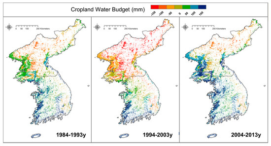 Spatial distribution and change of the cropland water budget in the Korean Peninsula over three decades.