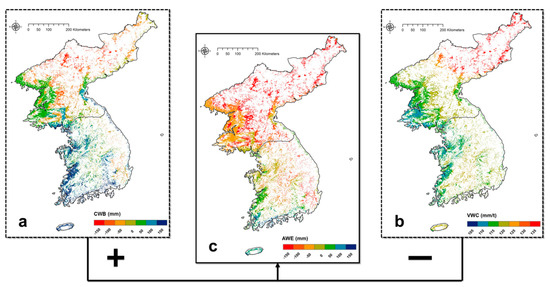 In agricultural land, the available volume of water is CWB, and that used in crop production is VWC. Thus, by subtracting VWC from CWB, we can get AWE (Equation (3)). The CWB (mm) and VWC (mm t−1) are different from each other in unit, but assume that they produce 1 ton of crop and calculate after removing ton from VWC. The higher the AWE value, the better is the water balance.