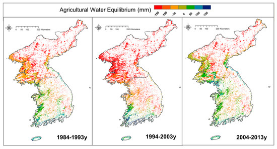AWE over the 30-year period was computed by deducting VWC, which indicates the water demand in croplands, from CWB, which indicates the water supply (Figure 8). In the 1980s, the average AWE value in the Korean Peninsula was −107.2 mm, which reduced to −164.4 mm in the 1990s, and then considerably improved to −64.0 mm in the 2000s. The average AWE in the 30-year period was −111.8 mm. The major factor influencing such differences over time was precipitation. Higher amounts of precipitation across the Korean Peninsula in the 2000s resulted in the higher AWE values.