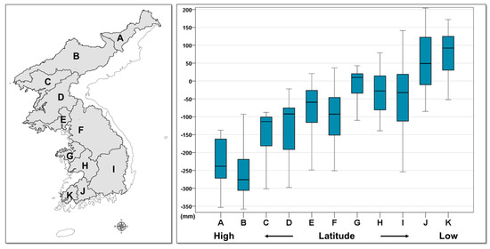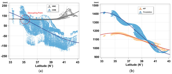 A more fundamental cause is that, at higher latitudes, both precipitation and AET drop concurrently, though there is a difference in the rate of decrease (Figure 13b). Thus, at a certain point of time, there are areas in which the precipitation exceeds the AET, which supply sufficient water to land [36,37]. However, regions above 40 °N in latitude in the Korean Peninsula—that is, North Korea—the relationship is reversed, so that negative conditions for the fundamental water balance appear. Such climatic characteristics may differ by region, but in East Asia, which experiences a temperate monsoon climate, there is a good possibility of seeing a similar pattern [65].