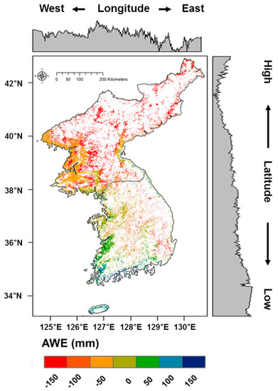 When sorting AWE data by the major river basins of the Korean Peninsula, it was confirmed that the values showed considerable discrepancies by latitude. In particular, most river basins in North Korea showed very low levels. The Yalu river basin, the longest and broadest in the Korean Peninsula, showed −275 mm on average, which meant that it was in the most non-equilibrium state. In river basins of the Youngsan River and the Sumjin River in South Korea, most areas showed positive AWE values, so it was confirmed that these river basins are those that have the most reserves of water, sufficient for agricultural use (Figure 11).