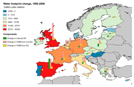 From 1995 to 2009 water use followed a growing trend worldwide. Whereas the rise in the EU27 water footprint represented 7% of the increase at the global level, this region accounted for more than 25% of the rise in the water embodied in imports in the world (see Table 1). On the whole, these countries tended to increase their virtual water imports (from EU27 and non-EU countries), reducing at the same time their internal water footprint. In fact, the water footprint increase (This growing trend is not conditioned by the selection of two specific years (1995 and 2009). As it is shown in Figure S1 in the Supplementary Information, the increase in water use was continuous during the whole period.) in the EU reached 175 km3, 84% of it corresponding to the growth of water embodied in products coming from countries outside the EU27, 24% to the virtual water exchanged within the region and 6% to the decline in domestic water use. These figures indicate that the EU27 countries kept externalizing pressures on water resources during the period, consuming goods produced in foreign countries that were mostly located outside the borders of the EU27.