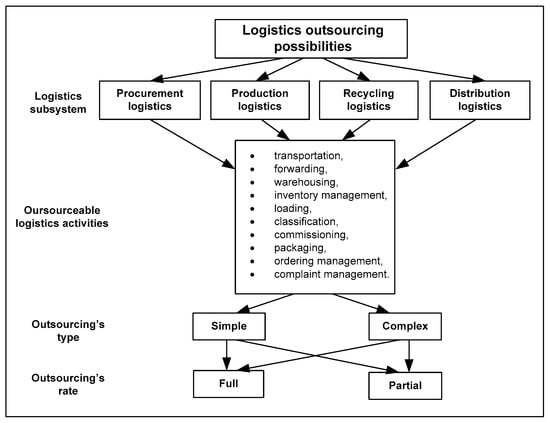 The outsourcing of primary logistics activities has been most frequently realized in case of manufacturing companies and logistics services providers []. Primary logistics services include transportation, warehousing, packaging, loading and commissioning activities. In several cases the secondary logistics services (management of inventory, orders, complaints, and sales) and even the tertiary services (consultancy, education, data processing, execution of payment execution) have been outsourced []. Other logistics services can be outsourced regarding procurement, production, distribution and recycling logistics subsystems [].