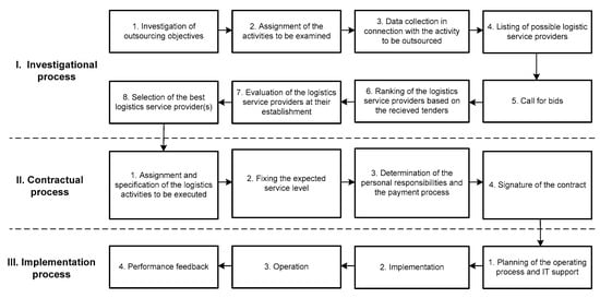 The logistics outsourcing process can be standardized based on the international literature [,,] as well as industrial experience [,]. The process is outlined in Figure 2. The outsourcing process can be divided into three parts, namely the outsourcing investigation-, contractual and implementation stages.