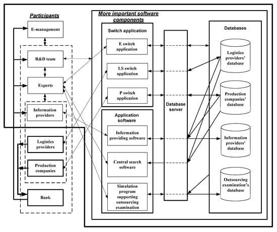 Figure 3 presents the elements of the logistics services outsourcing investigational system, as well as the relations between them. The electronic marketplace model can be divided into two parts: participants involved in the operation, and the most important software components (related applications, user software, database server, databases). This section fully introduces the basic concept’s participants and the relations between them.