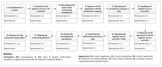 - Experts: The experts know operational algorithms and software of the electronic marketplace outsourcing investigational system. Their main tasks are introducing the outsourcing investigation alternatives to the clients, data collection, data processing and evaluation tasks related to the outsourcing examination. Other tasks are to upload the collected data to the proper database through a switch program. In addition, they are responsible for exploring further logistics providers and production companies using central search algorithms/programs [] and/or information providers’ databases.