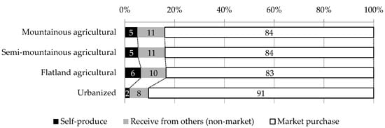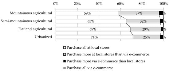 The survey found that 16% of food in mountainous and flat agricultural areas came from non-market sources, whereas 10% of food had non-market origins in urbanized areas (Figure 1). We found no significant difference between the three types of agricultural areas. This suggests that non-market food provision makes a non-negligible contribution to people’s food consumption in agricultural landscapes []. In terms of where the respondents purchased their food, the percentage of respondents saying that they purchased all of it at local stores was the highest in urbanized areas (71%) and the lowest in the mountainous agricultural areas (59%) (Figure 2). The households in more isolated rural areas tend to purchase food via e-commerce more than those in flat agricultural areas and urbanized areas, even though the amount purchased by e-commerce is still less than that obtained from local stores.