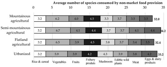 The average number of food varieties supplied by non-market provision ranged from 32.0 to 34.2 for the various land types, with no significant difference among the types of agricultural areas including urbanized area with small agricultural land (Figure 3). The family income and expenditure survey conducted by Japan’s central government (Statistics Bureau, Ministry of Internal Affairs and Communications) lists 190 food items (excluding beverages and eating at restaurants). Our results thus suggest that non-market food provision accounts for about 17% of all food varieties consumed at the household level. Vegetables constituted a relatively large number of such items (Figure 3), indicating that vegetables are common items among non-market food provision in Japan.