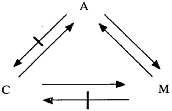 Triadic relation among attraction, configuration and movement (source: Hillier et al. [7]). A is attraction; C is configuration; M is movement.