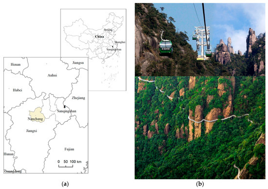 Location map of the study area (a); cableway and trail in Mt. Sanqingshan (b).