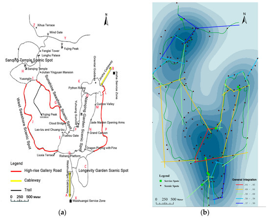 Space syntax has become a key method for studying the relationship among space, spatial structures and human behavior in the fields of urban geography, the built environment and scenic spots [11,12,13], especially with respect to small-scale areas. In the field of tourism, Landré found that the distribution of boats on the waterways of Cyperaceae National Forest Park was significantly correlated with the general and local integration of the road network [14]. By observing the spatial behavior of 1208 tourists in Ningaloo Ocean Park, Smallwood et al. concluded that the decision to visit a place depended significantly on the spatial formation of the road network [1]. In addition, attractions’ spatial occupations affect human spatial behavior, and different environmental elements have various impacts on tourist behavior [15]. Li et al. applied space syntax analysis to provide an understanding of road networks and space-time evolution and studied the correlation with tourist preferences for urban historic sites [16].