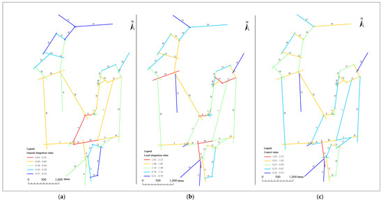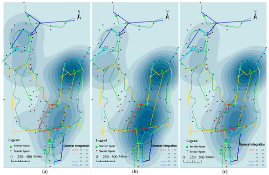 Analysis of the resort road network structure space syntax. (a) General integration; (b) local integration; (c) control value.