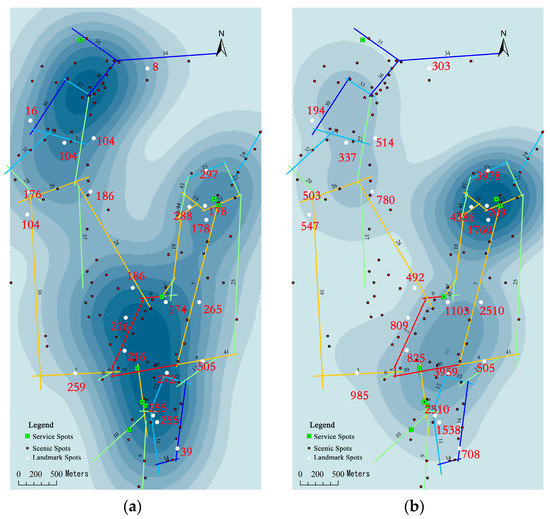 Mt. Sanqingshan organizes lines around two cableway stations, forming three loops within the scenic spot. A small number of necessary roads overlap the round-trip tourist flow. The visitor traffic data of 19 key sections or nodes have been added to the overall integration map (Figure 6a) of the kernel density and road network of the resort, and the website data regarding historical visits have been added to the landscape attention kernel density map (Figure 6b). With the highest overall integration, the area where Node D is located has received the most visits (615). Gallery Road E and F of the integrated kernel received 328 and 308 visits, respectively, and there were 300 visits to the roads where M and N are located (visits to Nodes M and N are different as some visitors return after reaching Node M). Given the spatial distribution harmony within the attraction space, there are many scenic spots within the K–F–E–D–N–M–O loop of the Nanqing Garden Scenic Area, which is a scenic spot and landscape attention density kernel with high sightseeing value and high road accessibility. Therefore, this scenic area received the most visits. Although Gallery Road K is at Level 3 of overall integration, it ranks third of 19 in terms of visits to the entire node. This is due to scenic attraction and spatial connection issues. Gallery Road K not only provides a view of Python Rising in the Mountain, but it also provides necessary and rapid access to the Nanqing Garden Scenic Area. Gallery Roads G and J, which serve as characteristic high-rise gallery road attractions of Mt. Sanqingshan, connect Sanqing Temple (H) and Nanqing Garden. However, H serves as a scenic spot density kernel, and it ranks low in terms of visits due to its low overall access, long distance and low landscape attraction. The quantity of tourists on the trail depends more on the accessibility of the entire road. Even in areas with high overall integration, but without concentrated scenic spots, tourists visit frequently because they must pass these areas to reach other areas.