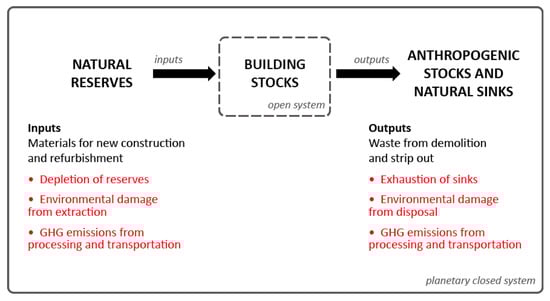 Simplified construction material flows and stocks, and the broad categories of their global environmental impacts shown in red. No impacts are noted for building stocks, as the material changes of repair and upgrade are captured under the flows in and out. The operational greenhouse gas (GHG) emissions of the existing building stock are considered outside the present scope.
