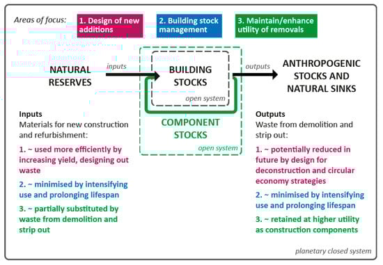 Reduction of future material inputs and waste outputs is an important aspect of the design of new additions to stock. Approaches in this mould have recently become associated with the idea of a circular economy. This encompasses a range of strategies [] that aim to take control of the end-of-life scenario, by encouraging greater consideration of the whole life cycle at the design stage. Circularity in relation to the built environment (e.g., [,,,]) harnesses the established field of design for deconstruction (DfD; e.g., [,,]). A change of perception is pursued, in which we see ‘buildings as material banks’ [,], and actively manage accounts of the materials deposited within them through material passports, Internet of Things devices, and BIM [,,,].