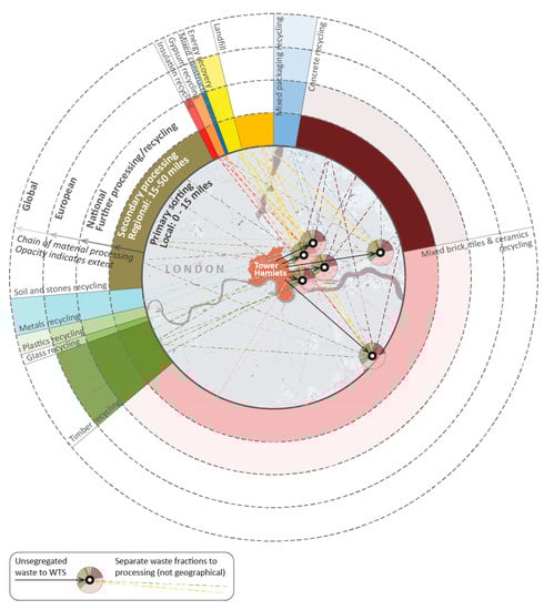 Diagram illustrating existing waste management logistics from case study projects. The map in the centre shows the area of London from which unsegregated site waste originated and the locations of waste transfer stations (WTSs). Arrows indicate the transfer of waste from construction sites to WTSs, and their links to onward waste processing. In the rings outside the map, the angle formed within a sector indicates the material’s proportion of total waste reported across all case study projects, and the opacity of the sector in each ring indicates the geographical extent of the material’s processing. Thus, the metal sector reaches as far as the outer ring at almost full opacity, because the majority of metal recycling happens beyond Europe.