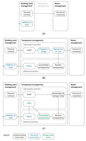 Current scenarios for the sequence of activities that determine treatment of existing building components: (a) no consideration of potential to retain component function—complete reliance on waste management, as seen in the case study projects; (b) nascent component management—formal or informal audit and engagement of new build team, allowing potential for some secondary use on site, as reported, e.g., in []; (c) nascent component management—formal or informal audit and knowledge of salvage traders, leading to some reuse off site. Combined use of (b,c) represents current best case scenario, with continued reliance on waste management for the majority of components removed from stock.