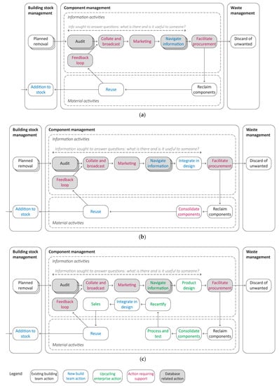 To enable exhaustive exploration of the potential for direct reuse, there is a need for effective information flows through a widely accessible database similar to an RMM. Figure 6a begins to address the identified shortfalls of RMMs by integrating an information gathering regime modelled on pre-redevelopment audits []. At present, the results of audits are used in isolation by the project team and only inform waste management decisions. If, instead, audits from many projects were collated in a database, with components that are to emerge as waste described systematically (and qualitatively as well as quantitatively), it would create a timely array of information. Potential demand actors could navigate the database online and agreements could be reached prior to strip-out, demolition, or deconstruction.