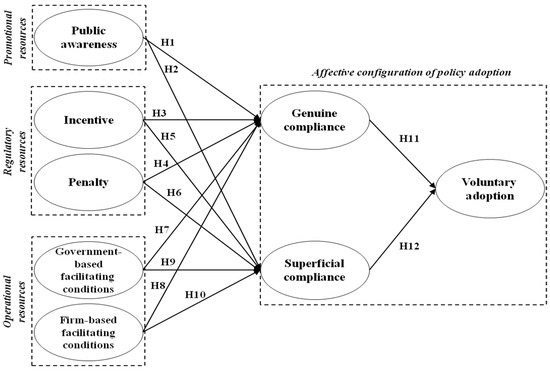 The resources of policy implementation are the external stimulations that form employees’ attitudes toward trade policies. From properly managed implementation resources, firms may obtain genuine compliance toward trade policies. Furthermore, the goal of properly allocated and managed implementation resources should be to lower firms’ superficial compliance toward trade policies. Jordan, Wurzel, and Zito [11] suggest that properly informed policy target groups are more likely to have positive attitudes toward adopting the policies. Victor [12] blame the lack of social awareness about policies as the cause for associates in a firm to believe that policies are a restriction that burdens their operations. If they have incomplete information, they will have difficulties visualizing how the trade policy would work and are unable to evaluate its benefits, costs, or risks [18]. Information on trade policies could be attained through raising public awareness [14]. With high public awareness of a trade policy, associates in firms are more likely to understand the purpose and importance of the policy [11]. With the understanding of purposes and consequences of the policy, associates may internalize the values of the policy and make the adoption decisions upon genuine compliance [32,34,36]. Yet, lacking high public awareness, firms may only adopt, if at all, because of superficial reasons such as following other firms’ adoptions or to gain an acknowledgement from the government [32,33,37]. These arguments lead to the following hypotheses.