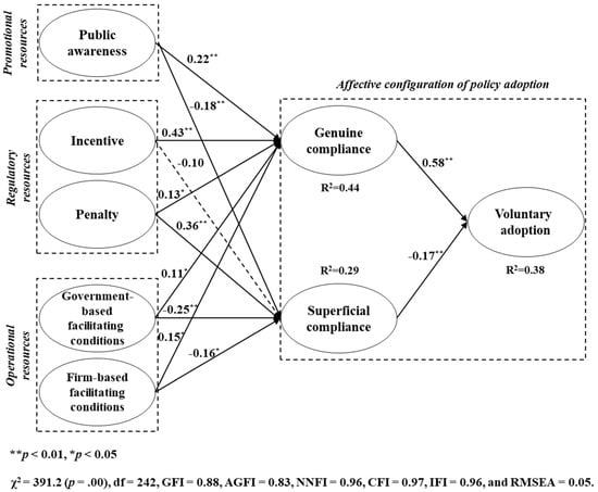 This section presents the results with regard to the effect of the resources of policy implementation on the firms’ genuine and superficial compliance and ultimately on the firms’ voluntary policy adoption. The outcomes of the structural model analyses are shown in Figure 2. Although in reverse order of the suggested hypotheses, it is conceptually clearer to explain the relationships between variables from dependent to mediating variables and mediating variables to independent variables.