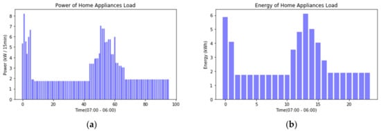 Home appliance usage pattern: (a) Power of home appliance load; (b) Energy of home appliance load.