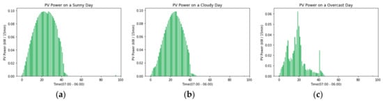 Daily power of photovoltaic (PV) generation system: (a) Sunny day; (b) Cloudy day; (c) Overcast day.