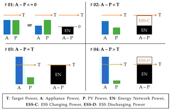As shown in Figure 3, there is a total of four cases when there is “A” demanding energy, “P” supplying energy, and the operating target power “T” of the ESS. The first is when A − P is less than or equal to 0, and the second is when A − P is less than T. The third is when A − P is equal to T, and the last is when A − P is greater than T. The following figure depicts each situation. Determination of charging and discharging, or waiting command during the unit time in accordance with four conditions and calculation of the detailed charging and discharging energy are described from the next paragraph.