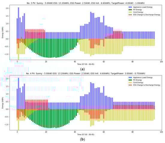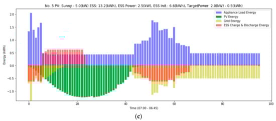 The ideal result of the proposed algorithm is that the ESS properly performs charging and discharging regardless of energy generation by PV, which then reduces the energy burden on the energy network or makes the energy consumption pattern constant. Figure 4 presents a typical graph of results according to simulation conditions. In the graph, a positive value indicates energy consumption and a negative value indicates energy production. That is, if ESS has a positive value, it is a charged load, and if it has a negative value, it is a discharging energy source.