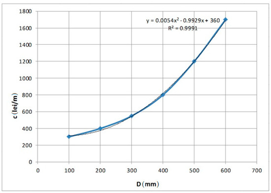 Based on statistical data and the comparative situation of the cost indices obtained during the execution of water discharge networks from mining works, the average values were determined for the specific investment costs in the networks’ pipes, whose variation with diameter is graphically presented in Figure 3.