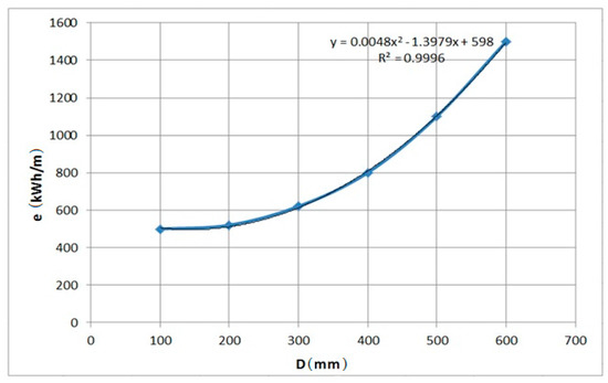 The influence of the diameter on the variation of the specific energy consumption included in the water discharge network’s pipes [19].