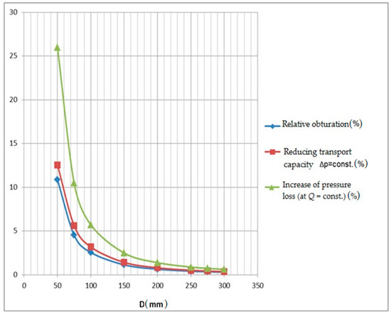 Experiments highlight that an equal degree of pipe obstruction is translated into a relative percentage decrease, differentially, of the pipe’s transport capacity, and respectively, in a relative variable increase of the pressure loss determined by the relative differential obstruction of the section for a series of diameters. The values obtained for an absolute obstruction of 200 mm2 are presented in Figure 4, and centralized in Table 3.