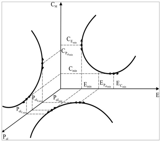 The coordinates of the proposed chart are represented by: CM–monetary cost; E–total energy used; and Pol–environmental impact. The values of the specific costs, which correspond to coordinates, were expressed as a percentage of the maximum value in order to have a common measurement unit.