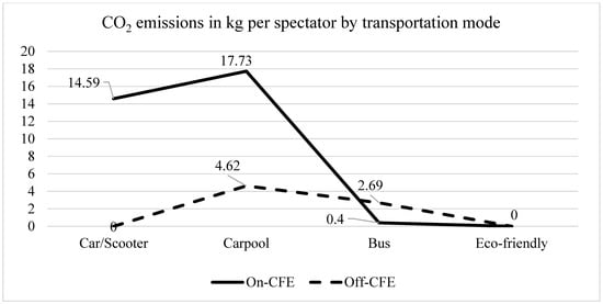 Overall, the mean CO2 emissions per spectator for the on-CFE was (M = 12.67 kg, SD = 20.21 kg, n = 253) and (M = 4.46 kg, SD = 4.45 kg, n = 235) for the off-CFE (see Table 4). The mean CO2 emissions per spectator by transportation mode and location are shown in Table 2. Two differences between locations are: (1) for the carpool mode, the mean CO2 emissions per spectator for on-CFE was (M = 17.73 kg, SD = 20.44 kg, n = 151), whereas, for off-CFE, carpool mode was (M = 4.62 kg, SD = 4.68 kg, n = 214); and (2) the bus mode mean for the on-CFE was (M = 0.40 kg, SD = 0.18 kg, n = 8) versus (M = 2.69 kg, SD = 0 kg, n = 21) for the off-CFE (see Table 2).