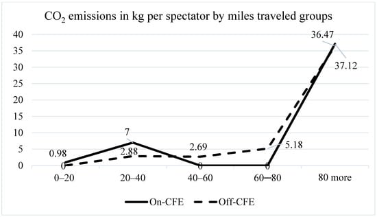 The mean CO2 emissions per spectator for the miles traveled groups was similar for the “80 miles or more” group at both locations. Only the “20 to 40 miles” traveled group was common in on- and off-CFE, which was used for comparison.