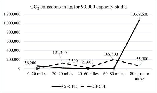 RQ3: How do CO2 emissions by miles traveled groups differ in an on-CFE versus an off-CFE? If we assume equal capacity (90,000 spectators) for both stadiums, were there differences in CO2 emissions for an on-CFE versus an off-CFE?