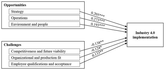 Hypothesis 4 (H4) proposes that Industry 4.0-related challenges with regard to competitiveness and future viability have a negative effect on manufacturing companies’ implementation of Industry 4.0. The empirical results indicate a significant and negative relationship (β = −0.138, t = 2.525, p < 0.05). Accordingly, H4 is supported.