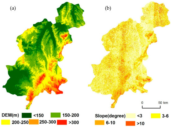 For the CBNC, the terrain is relatively flat and the areas with a slope gradient of less than 3 degrees account for half of the total croplands (Figure 2). Taking 200 m and 3 degrees as grouping thresholds, the elevation and slope gradient were divided into two groups respectively. The ANOVA analysis for both the elevation and slope gradient showed significant differences between the groups (Table 7).