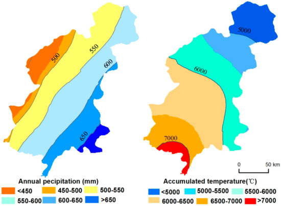 Climate data, including monthly precipitation and daily temperature from 2000 to 2013, were obtained from the Meteorological Bureau of Jilin Province. The mean annual precipitation and accumulated temperature (≥10 °C) were calculated and the data were spatialized via the Kriging method (Figure 3).