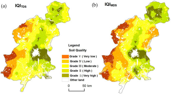 In general, the soil quality status in the CBNC varies from moderate to high [15,22]. The assessment results of the TDS indicator method indicated that soils with moderate quality (Grades III and IV) were dominant and accounted for 69.30%. Meanwhile, results from the MDS indicator method showed a better quality for soils in this area. Grade II and grade III were the dominant grades and accounted for 57.84%. The proportion of high quality (Grade I) and very low quality (GradeV) increased. The mean value of the IQI using the MDS indicator method was higher than that of the TDS indicator method (Table 6 and Figure 2).