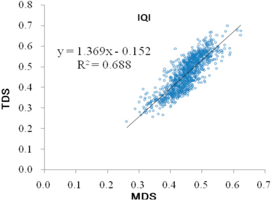Generally, 30% of the total data can be used as test data. We extracted 30% of the sampling points (the number is 507) randomly from overall sampling points to conduct the test analysis via the subset feature function in ArcGIS 10.0. Using a direct comparison, the result showed an agreement of 53.65% between the grades of the TDS and MDS methods (Table A3 and Table A4). The correlation between the TDS and MDS indicator methods for the IQI indices was significant with Pearson coefficients of 0.75 (p < 0.001). The linear relationships among the IQI of the TDS and MDS indicator methods (Figure 5) showed higher correlation coefficients with a R2 value of 0.688.