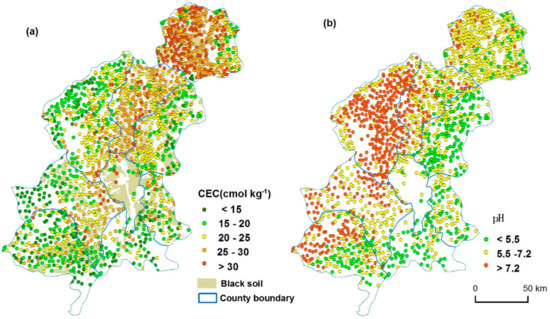 Dot distribution maps of CEC (a) and pH (b) of the study area.