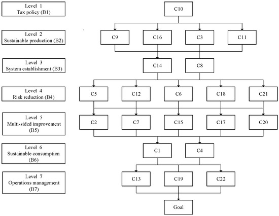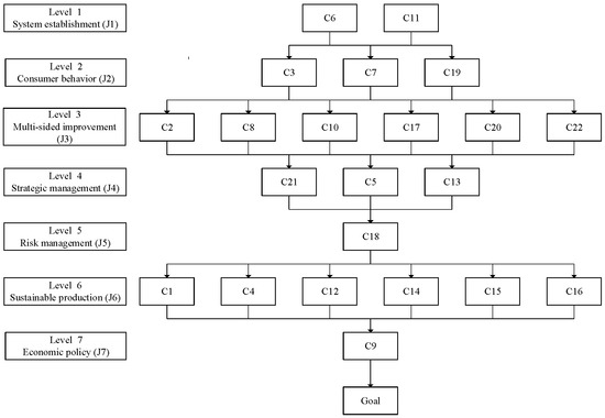 ISM is used to transform unclear, poorly articulated mental models into visible, well-addressed models [44,45]. The purpose of using ISM is to analyse complicated issues according to systematic and logical thinking supported by the judgement of experts [46,47]. Mathiyazhagan et al. [48] emphasized that experts’ practical experience and knowledge can be used to decompose a complicated system into several sub-systems (elements) and construct a multilevel structural model. Zhang et al. [49] used ISM to analyse the relationship between the factors that impact a network reconfiguration. Shen et al. [50] examined and evaluated the factors that affect the implementation of an emission trading system in the building sector based on a hierarchical structure. These studies have shown that ISM has been applied in a wide range of fields to overcome real-world problems.