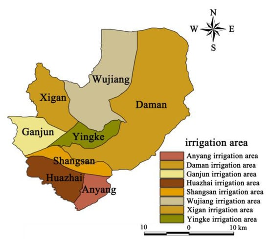 Irrigation areas are the basic regional units for the water resources management in rural areas especially. In China, the irrigation areas not only gather a large amount of rural population and agricultural production but also consume a lot of water resources. Due to the highly intense exploitation and utilization of water resources for long time, the water environment problems have been extremely serious in irrigation areas in China and seriously threaten the sustainable economic and social development of rural areas [,,]. Therefore, it is of great significance to strengthen the water resources management in the irrigation areas in order to achieve the sustainable utilization of limited water resources and development in China.