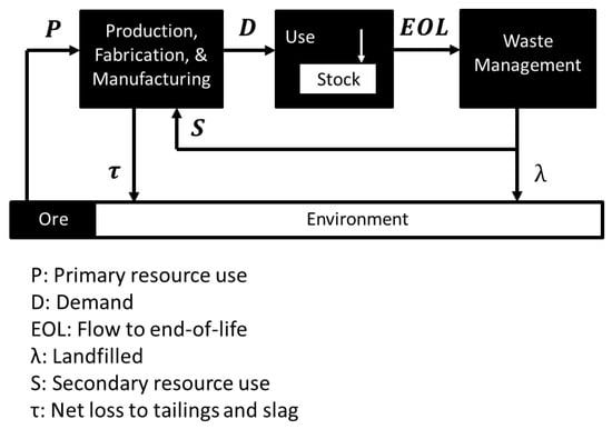 This study uses dynamic material flow analysis (MFA) [30] to estimate time-series primary resource use. This is based on Figure 1, which represents the life cycle of metals [31]. From the mass balance in the production, fabrication and manufacturing stage, and waste management stage in Figure 1, primary resource use and flow to end-of-life of resource , in year , are described by Equations (4) and (5), respectively.