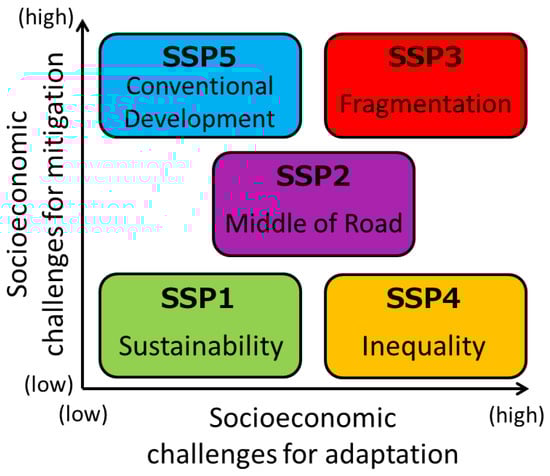 SSPs were recently developed as five future scenarios of future population and GDP, by country. These were developed from the viewpoint of socioeconomic challenges related to mitigation and adaptation (Figure 2). According to O’Neill et al. [64], socioeconomic challenges for mitigation are “defined as consisting of: (1) factors that tend to lead to high reference emissions in the absence of climate policy because, all else equal, higher reference emissions makes that mitigation task larger, and (2) factors that would tend to reduce the inherent mitigative capacity of a society”. Also, socioeconomic challenges for adaptation are “defined as societal or environmental conditions that, by making adaptation more difficult, increase the risks associated with any given projection of climate change”. For example, Figure 2 shows that SSP5 is the future scenario in which mitigation challenges dominate, and SSP1 is the future scenario with low challenges.