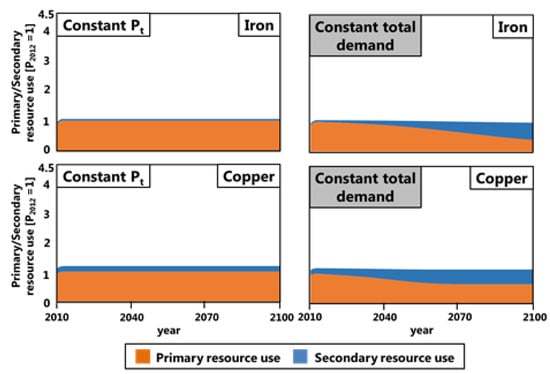 Time-series primary/secondary resource use of iron and copper, based on the constant case and the constant total demand scenario. Each value is expressed relative to the primary resource use in 2012 (iron: 1626.2 million ton, copper: 20.6 million ton).