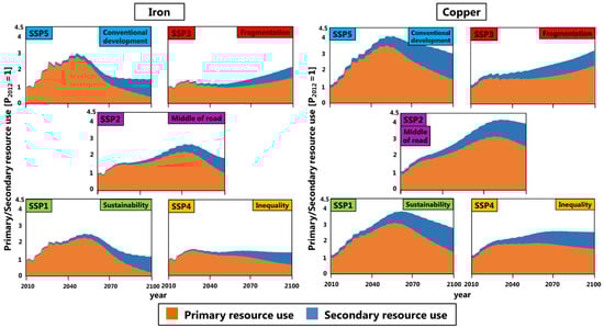 Time-series primary/secondary resource use of iron and copper in each SSP. Each value is expressed relative to primary resource use in 2012.